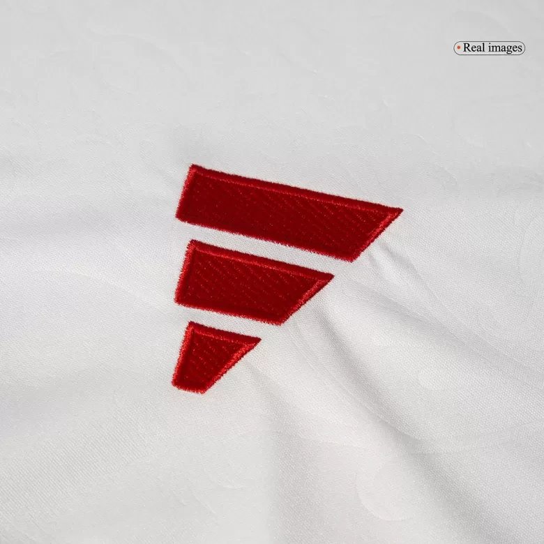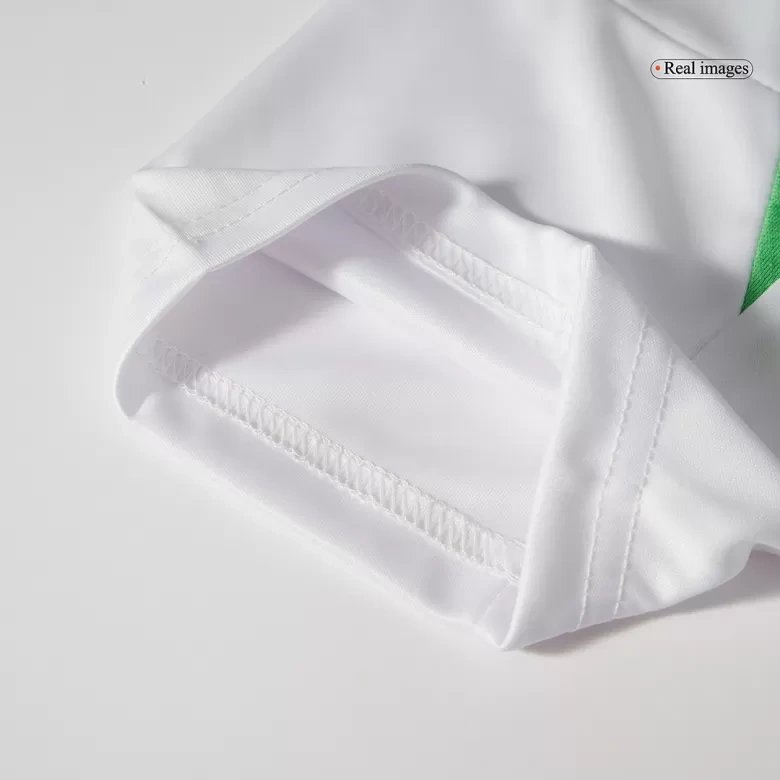 The Algeria 2024 home football shirt is predominantly white with light green details, officially called ‘Semi Flash Green’. The Brand logo is red.