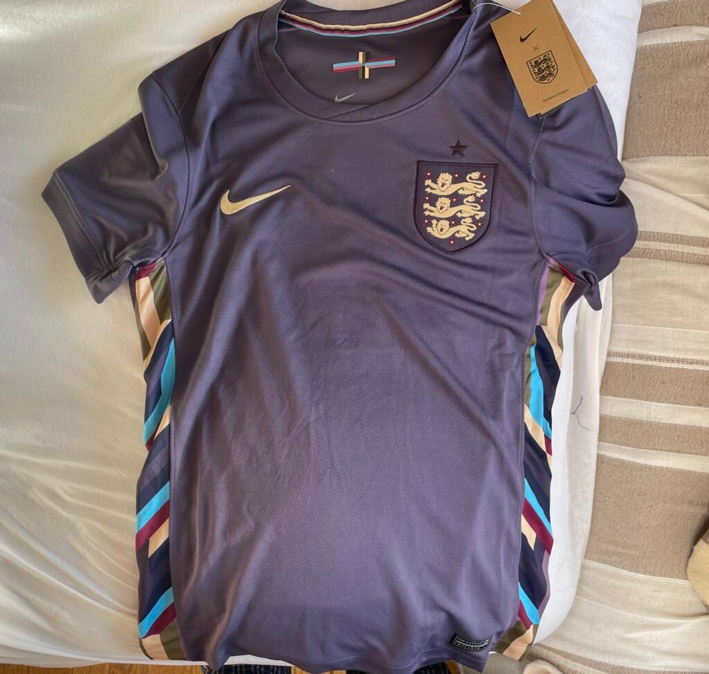 What lets the England 2024 away kit stand out is the multicolor design on the side of both sides.